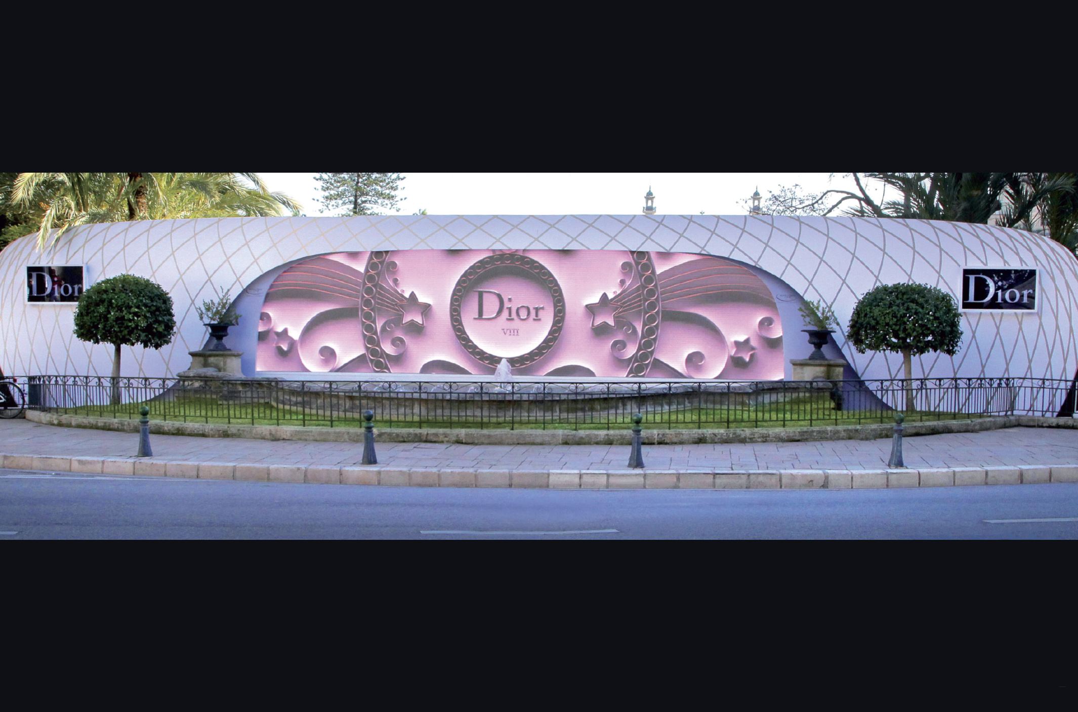 Installation d’une structure métallique de 300ml, habillée de bois et recouverte de Toile PVC avec bandes en vinyle argenté + location de 2 écrans LED outdoor 17 x 2,5m